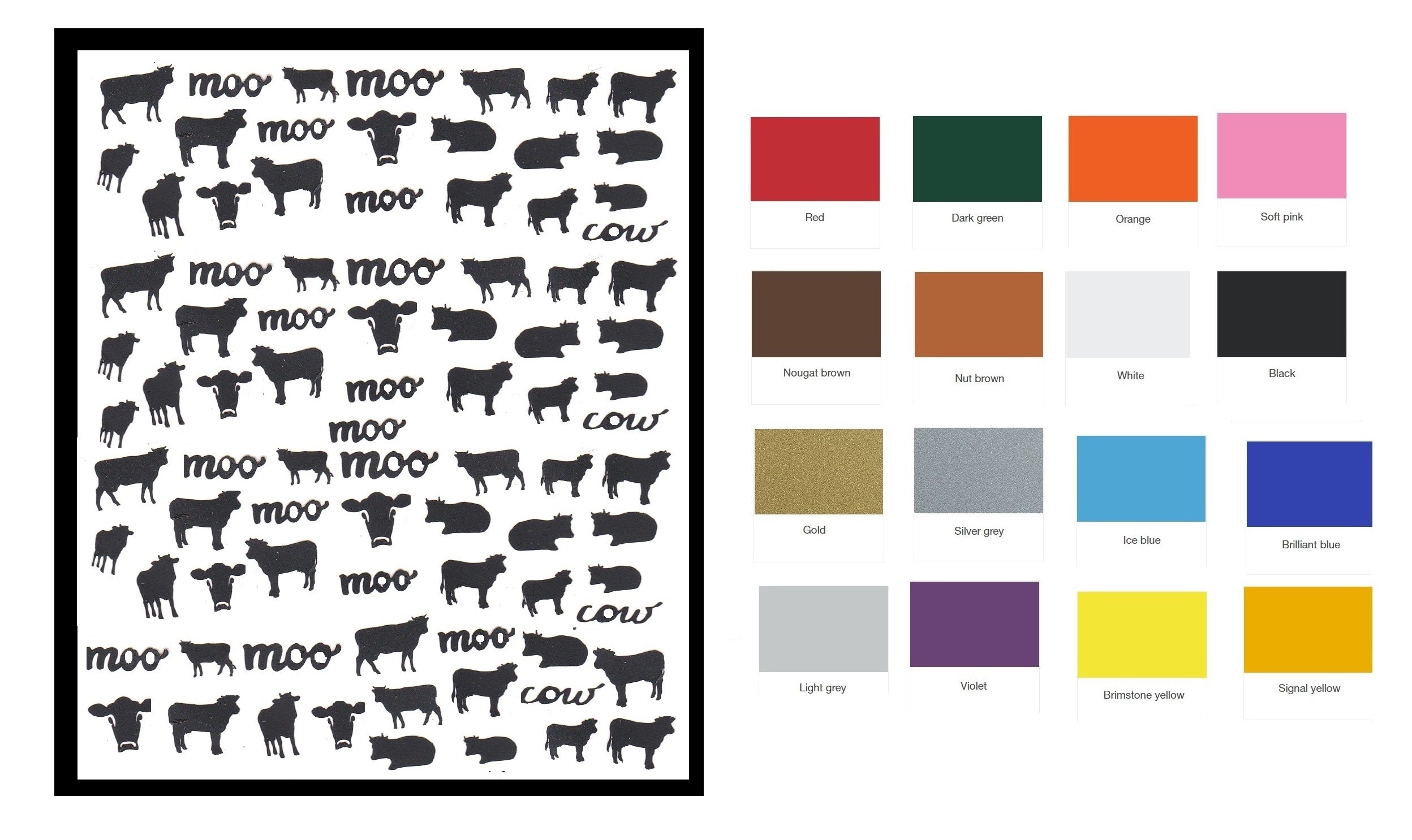 Cow Nail Stickers from £4.00 Colour Red Dark Green Orange Soft Pink Nougat Brown Nut Brown White Black Gold Silver Grey Ice Blue Brilliant Blue Light Grey Violet Yellow Signal Yellow Lavender Qty. Add to Cart This item is currently on backorder but you can still purchase it now and we'll ship as soon as more become available. Sizes vary from 0.2 inches to 0.5 inches Simply Peel and stick and for a Glossy result and longer lasting add top coat Easy to Apply Instructions are below and will also be sent with the Stickers Tweet Previous Next