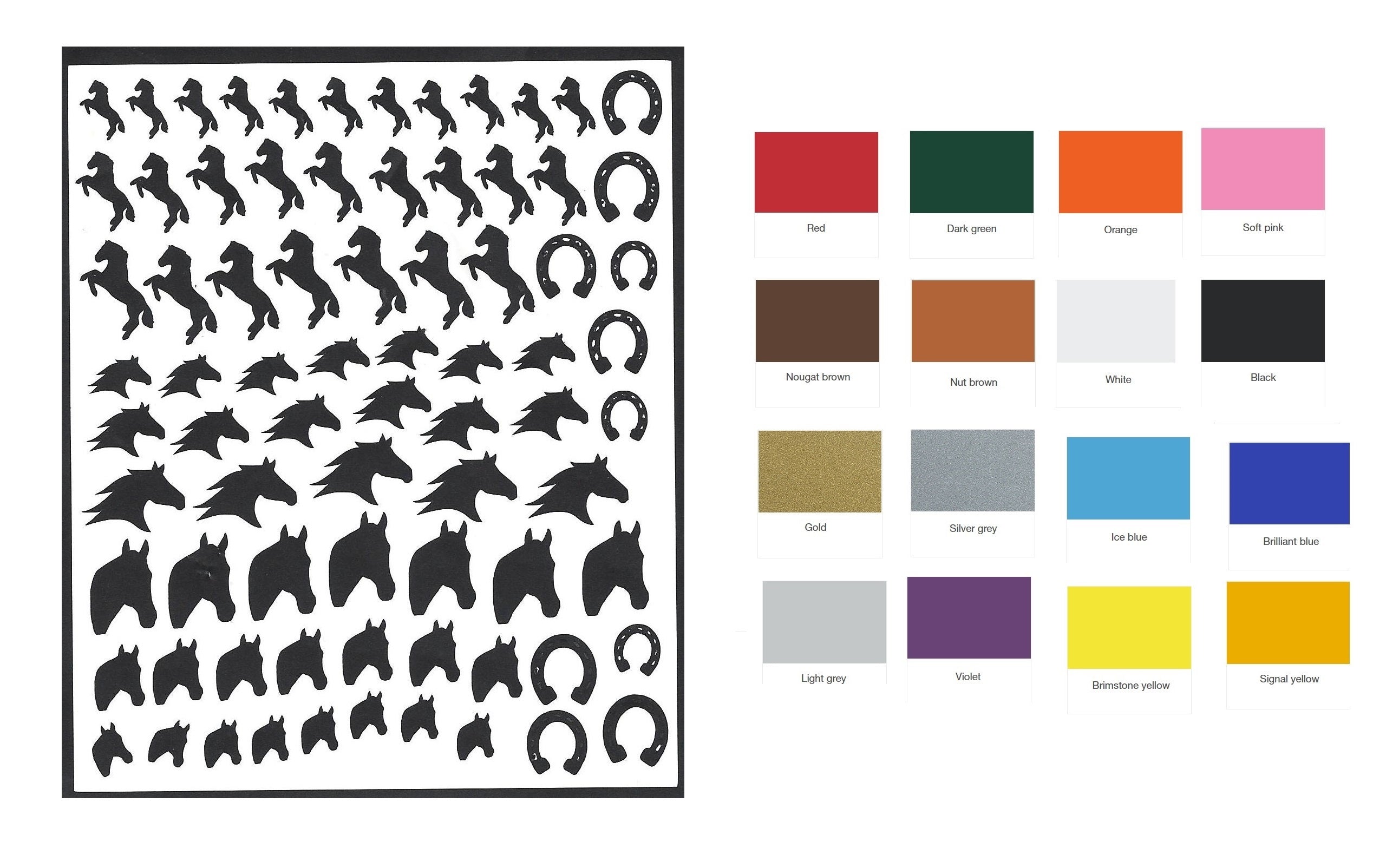 Horse Nail Stickers from £4.00 Colour Red Dark Green Orange Soft Pink Nougat Brown Nut Brown White Black Gold Silver Grey Ice Blue Brilliant Blue Light Grey Violet Yellow Signal Yellow Lavender Qty. Add to Cart This item is currently on backorder but you can still purchase it now and we'll ship as soon as more become available. Sizes vary from 0.2 inches to 0.5 inches Simply Peel and stick and for a Glossy result and longer lasting add top coat Easy to Apply Instructions are below and will also be sent with the Stickers Tweet Previous Next